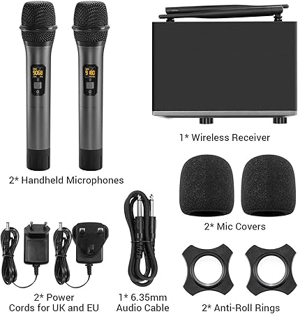 - Lo que obtienes: 1 x receptor inalámbrico, 2 x micrófonos de mano, 1 x cable de audio de 6,35 mm a 6,35 mm, 2 x cables de alimentación para UK y EU, 2 x anillos antideslizantes y 2 x cubiertas de micrófono.