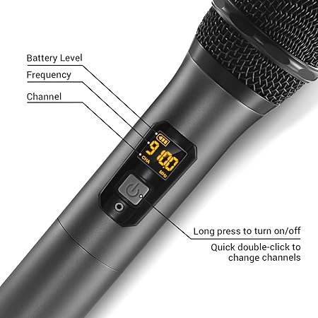 - Material Resistente & Duradero - Micrófono totalmente metálico con rejilla de malla de acero que es especialmente resistente al impacto y la corrosión. Es muy resistente y duradero. La caja de recepción de metal está diseñada con una pantalla LCD, la frecuencia, la señal, el nivel de la pila y otra información claramente a simple vista.